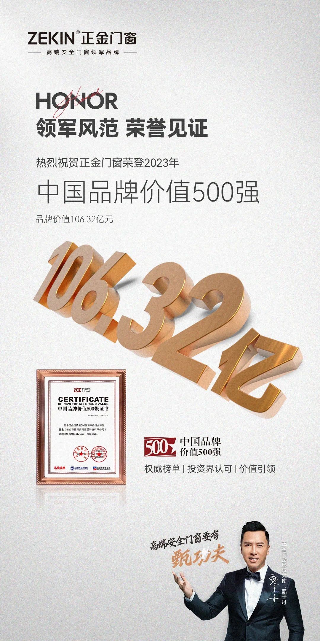 门窗一线品牌:正金门窗106.32亿!正金门窗荣登中国品牌代价500强